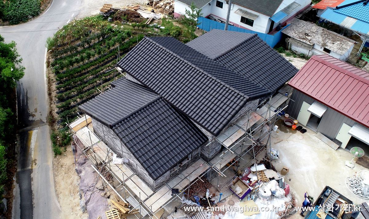 이번 현장에 사용된 기와는 마자론 기와의 네그라 제품입니다. 중후하고 기품 있는 검정색 기와로서 일반 붉은 점토기와에 검정 도료를 칠한 것이 아니라 밤색 기와를 베이스로 컬러를 입힌 것이라 단색 기와이지만 가장 고급 기와에 속하며 가격 또한 일반 변색 기와보다도 높습니다. 무광택으로 처리된 기와의 표면은 중후하고 깊이 있는 느낌을 주어 한식 스타일의 집이나 현대적인 건축물 모두에 무척 잘 어울리며 벽체 색깔에도 크게 영향을 받지 않아 다양한 스타일의 외벽에 폭넓게 어울리는 장점이 있습니다.