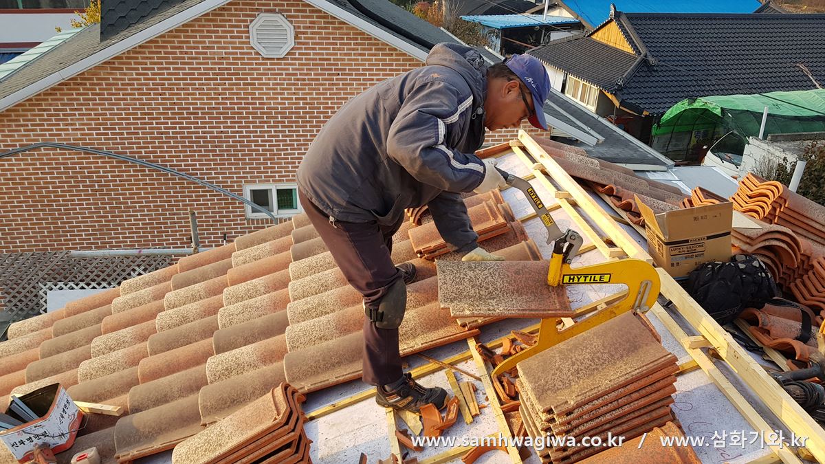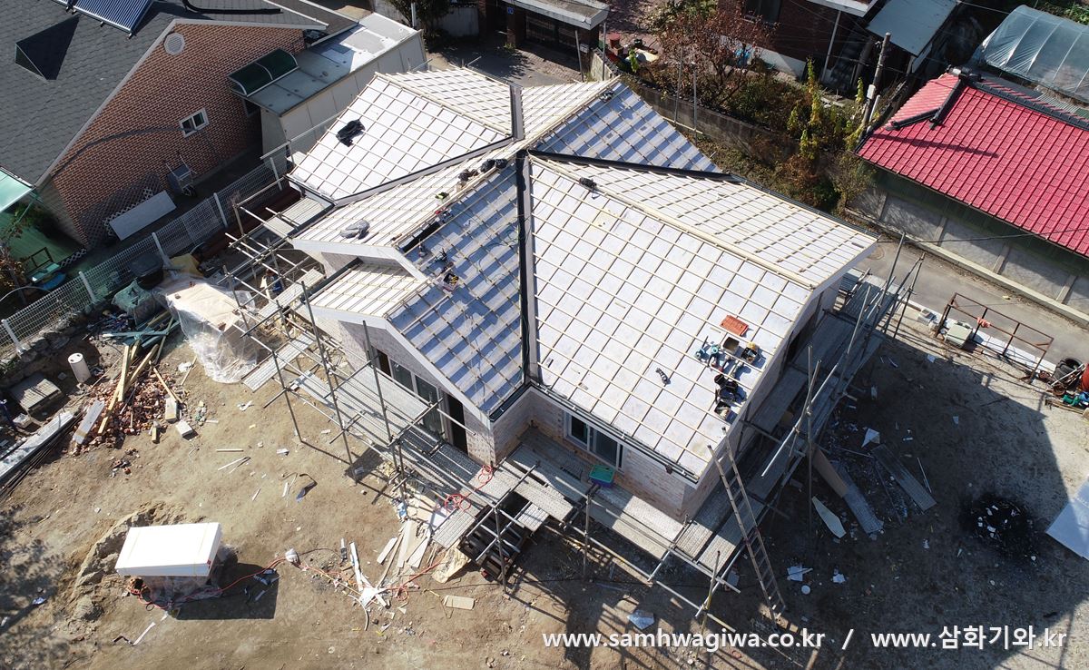 세로상을 놓고 있네요. 샌드위치 패널 지붕의 경우 지붕 수평이 이미 잡혀 있기 때문에 가로상만으로도 기와 시공이 가능하지만 지붕 아래의 통풍과 수명 연장을 위해서는 세로상까지 시공하는 이중상 시공이 바람직합니다. 슬라브 옆면에는 시멘트사이딩으로 예쁘게 마감되어 있는 것이 보이네요.