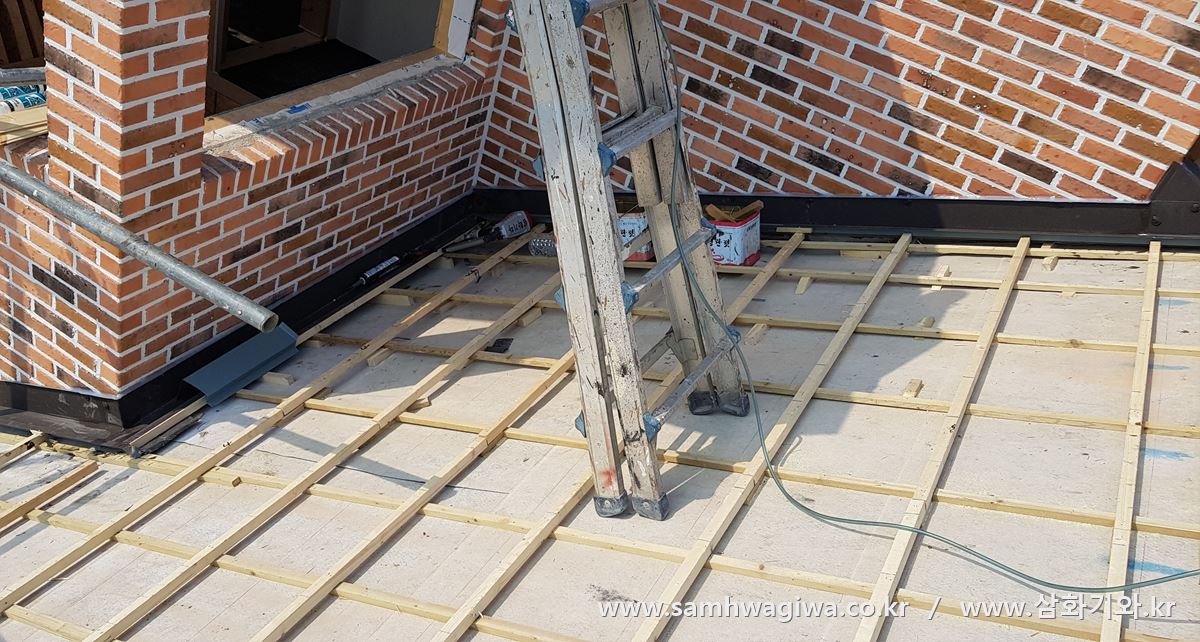 ㄱ자 형태로 후레싱이 심어질 곳에도 세로상을 설치합니다. 사진을 보면 오른쪽 코너쪽으로 갈수록 세로상이 약간 들려 있고 그 아래에 쐐기 등으로 괴어 놓은 것이 보이는데요, 빗물의 원활한 배출을 위해 의도적으로 한쪽 끝을 경사지게 하기 위해 위와 같이 작업한 것입니다.