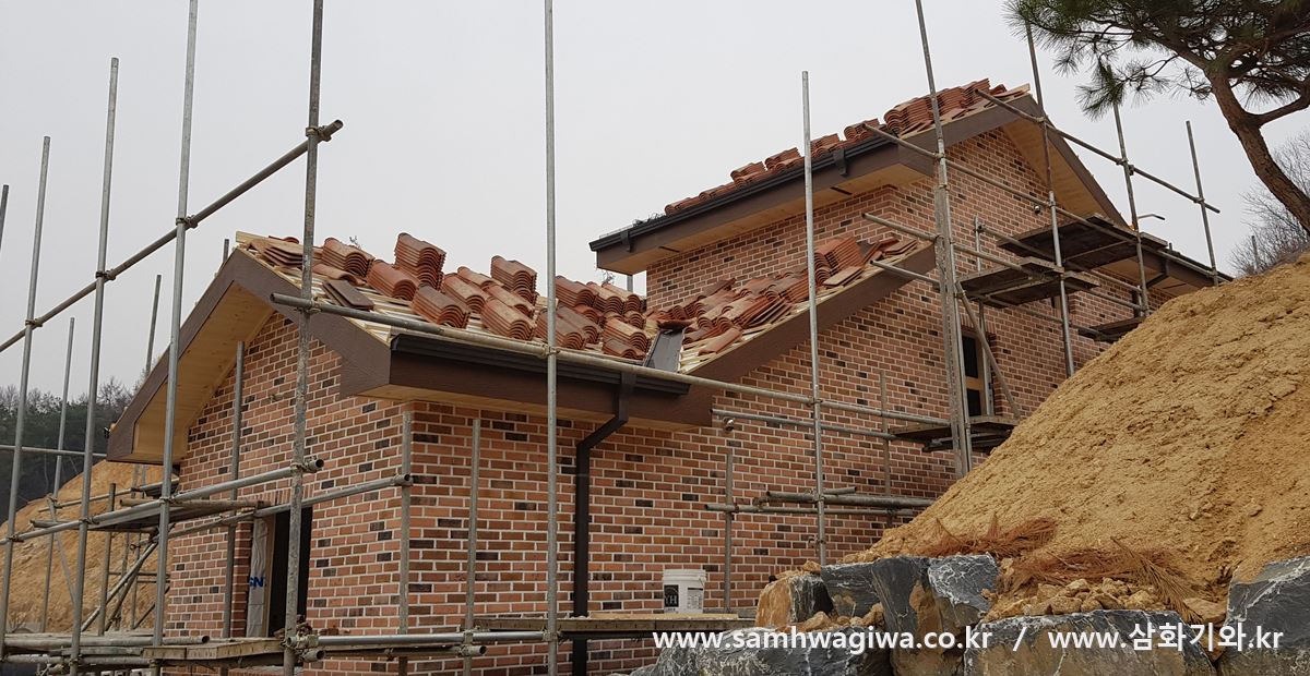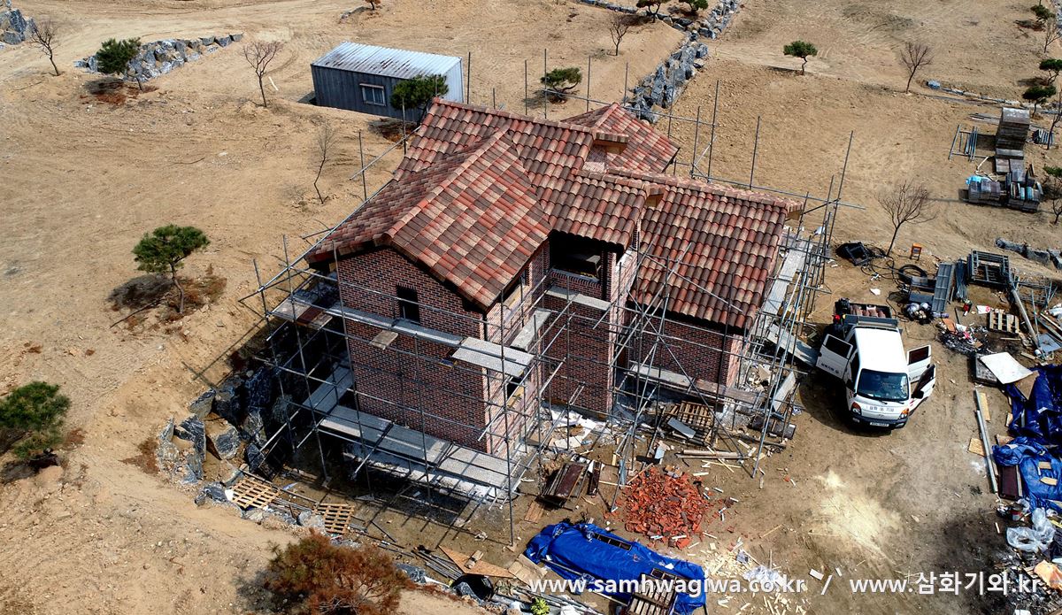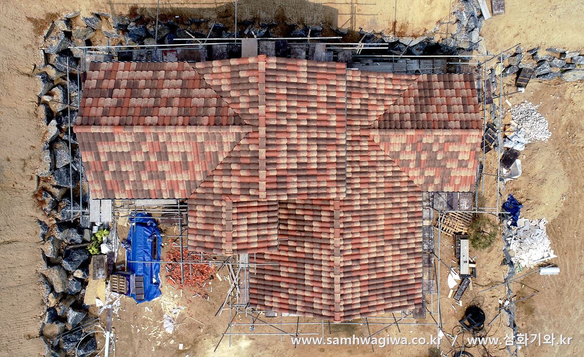 기와 시공은 2층부터 진행합니다. 일부 바닥 기와가 깔려 있는 모습이 보이네요.