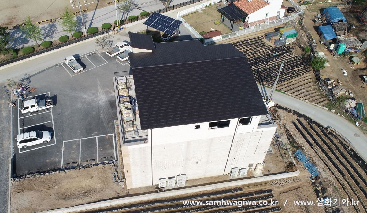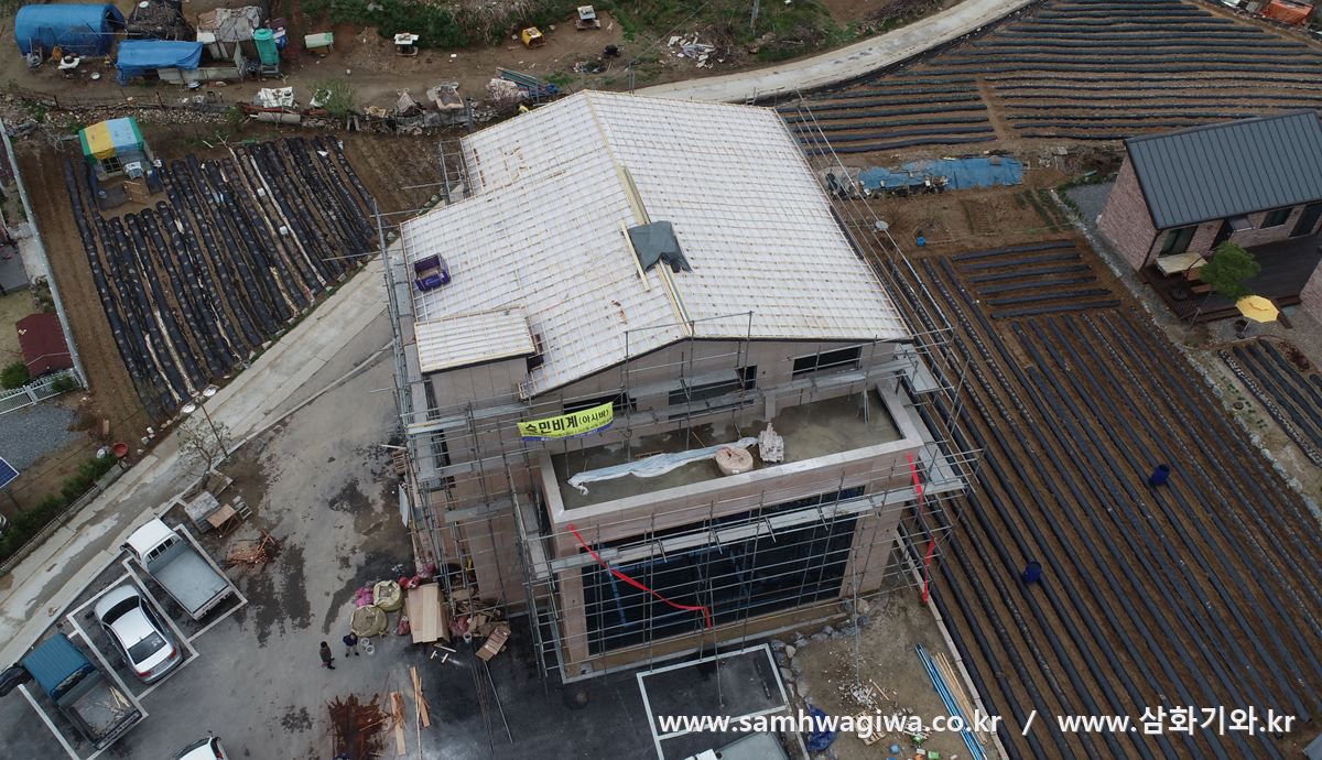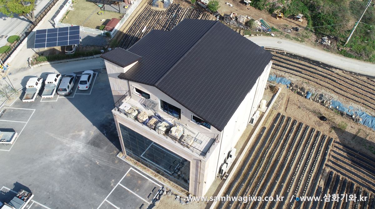며칠이 더 경과한 후 드론 촬영을 위해 다시 찾은 현장의 모습입니다. 건물 주위에 설치되어 있던 비계도 모두 철거되었고 창호 및 옥상 난간의 펜스도 설치가 끝나 건물의 분위기가 이전과는 전혀 달라 보입니다. 건물의 층고가 높아 지상에서 기와면이 잘 보이지 않는다는 점이 아쉽긴 하지만 살짝 보이는 갓기와만으로도 충분히 평기와의 매력이 전해지는 것 같습니다.