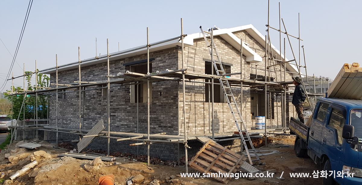 며칠 후 벽돌 조적과 줄눈 작업이 끝났다는 연락을 받고 기와 시공을 위해 현장을 다시 찾았습니다. 외벽은 회색 계열의 벽돌로 감싸 중후한 느낌을 풍기고 있고 지붕 슬라브 옆면에는 흰색 페인트로 깔끔하게 마감이 되어 있네요.