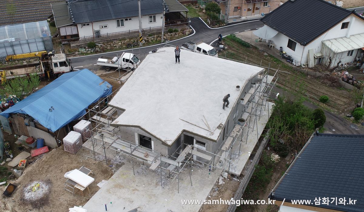 위 사진의 하얀색 페인트로 칠해 놓은 슬라브 옆면을 자세히 보면 파란색 원으로 표시한 꼭지점 부분은 두꺼운 반면에 붉은 색 원으로 표시한 아래쪽 부분은 두께가 얇은 것을 알 수 있습니다. 지붕 콘크리트 타설을 할 때 신경을 덜 쓴 모양입니다. 이 상태 그대로 기와 시공을 하면 갓기와 아래 부분이 예쁘게 시공되지 않기 때문에 각상을 이용해 전체적인 두께를 일정하게 맞추어 주어야 합니다. 하단부 쪽의 각상을 지붕면과 많이 띄워서 슬라브 두께를 조정한 모습이네요.