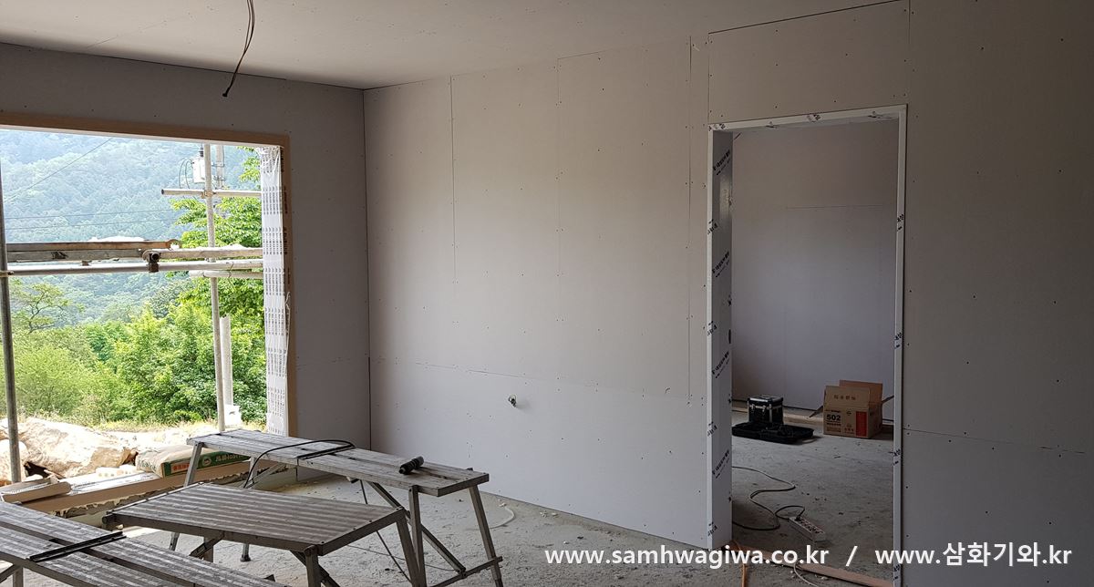 지붕 위에 방수 시트를 덮어 놓지 않아 아직 내부 인테리어는 진행되지 않고 있네요. 샌드위치 패널로 벽체와 문틀을 만들어 놓은 것이 보입니다.