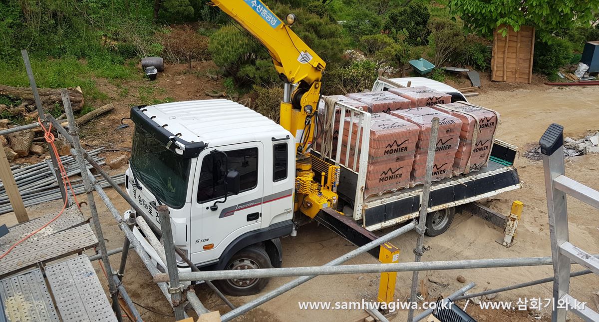 드디어 기와를 실은 차량이 도착했습니다. 이번에 시공될 기와는 모니어(Monier)사에서 만든 스패니쉬 타입의 기와인 갈로-로만(Gallo-Romane)이라는 모델입니다. 그 중에서 코퍼(Copper)라는 색상인데 황토색을 베이스로 다양하게 변색 효과를 준 기와로서 살짝 파스텔톤의 느낌을 주는 아름다운 변색 기와입니다. 모니어사는 프랑스의 지붕재 생산 회사로서 세계 1위의 글로벌 지붕재 생산 기업입니다. 국내에서는 (주)서중인터내셔날코리아와 파트너쉽을 맺고 제품을 공급하고 있습니다.