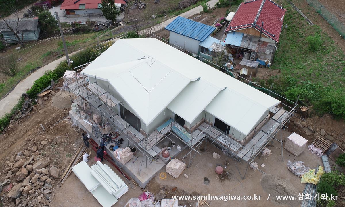 이번 현장은 제천시 봉양읍 학산리에 위치한 개인주택 신축 현장입니다. 샌드위치 패널로 골조와 지붕을 구성한 단층 주택으로 지붕의 모양은 변형된 T자형 구조를 가지고 있습니다.