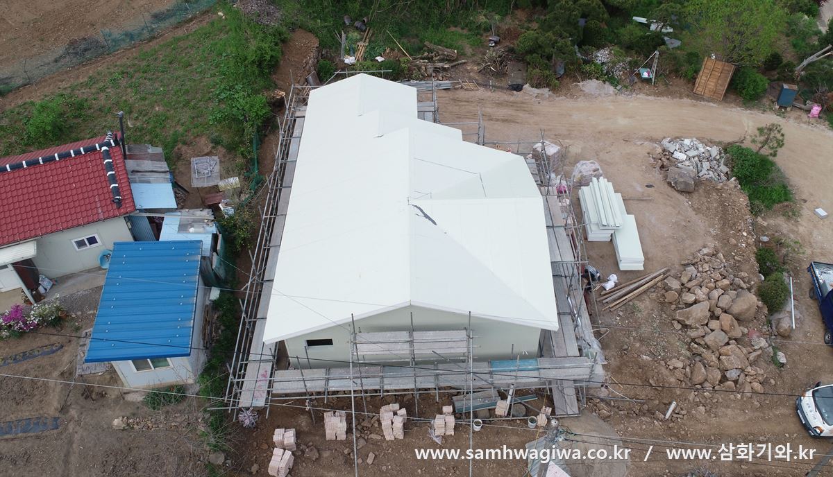 외벽에는 벽돌 조적 작업이 한창 진행 중입니다. 이번 현장의 지붕은 기와면과 외벽면이 만나는 곳이 있기 때문에 기와 시공은 벽돌 조적 및 줄눈 작업까지 완성된 후에 진행해야 합니다. 지붕 처마의 후레싱 작업도 아직 이루어지기 전이라 샌드위치 패널 절단면의 스티로폼이 그대로 노출되어 있는 것이 보입니다. 기와 작업을 위해서는 후레싱 작업 역시 미리 마무리되어 있어야 합니다.