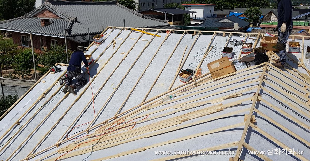 갓기와부터 차근차근 시공에 들어갑니다. 처마 끝에는 새들의 침입을 막을 새막이가 부착되어 있는 것이 보이네요. 각상에도 기와를 놓을 자리가 먹선으로 표시되어 있는 것이 보입니다. 이렇게 사전에 정확한 설계를 하고 기와를 시공해야만 완벽하고 예쁜 지붕이 나옵니다. 경험만을 믿고 자신의 감으로 기와 시공을 하면 절대 예쁜 지붕이 나오지 않습니다.