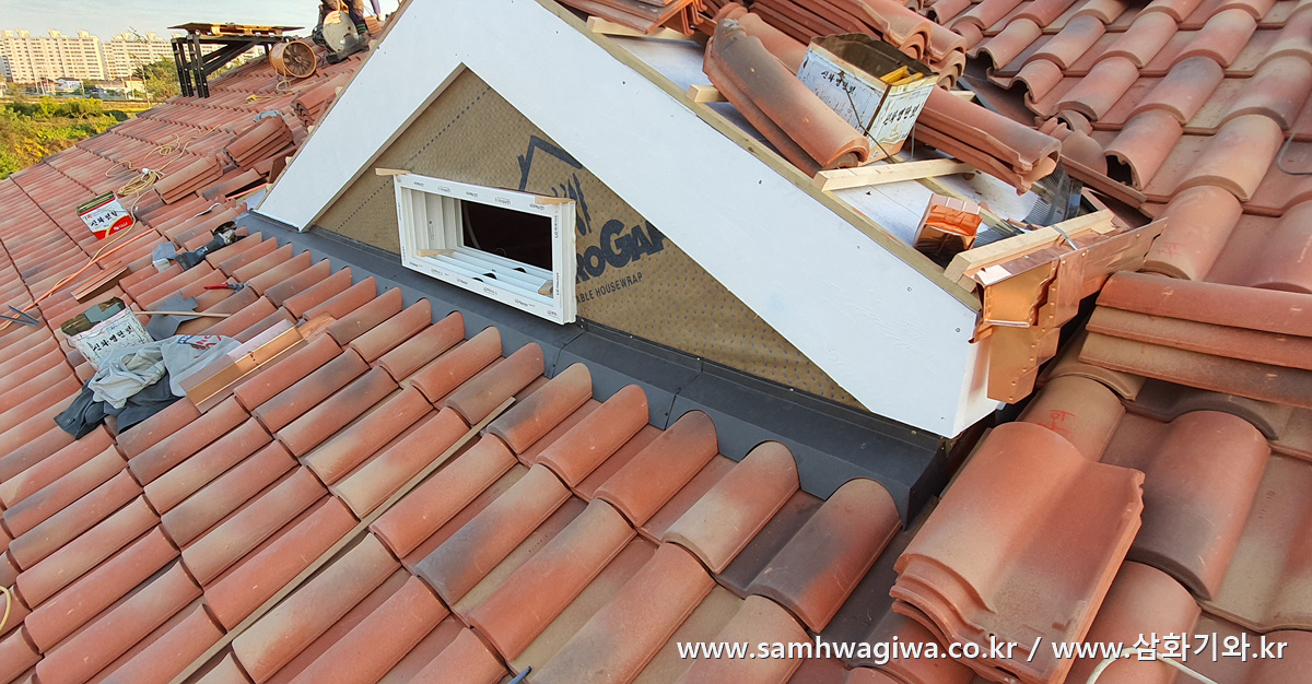 드디어 기와 시공에 들어갑니다. 끝기와부터 차근차근 올라가며 진행되는 모습입니다. 빗물 유도 후레싱이 기와 밑으로 숨겨져 깔끔하게 처리되는 것이 보이네요.