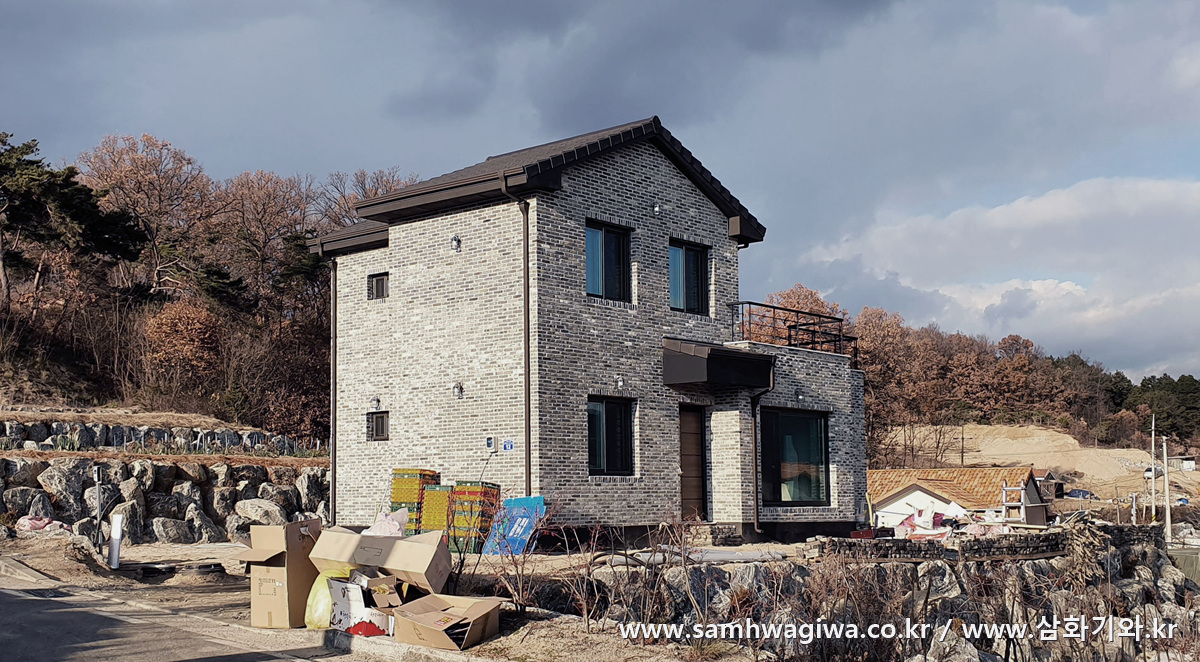 줄눈 작업까지 끝났다는 연락을 받고 기와 시공을 위해 현장을 다시 찾았습니다. 고벽돌로 시공을 해서 그런지 약간 고풍스러운 느낌이 나는 것 같습니다. 고벽돌이란 중국의 오래 된 건물을 허물 때 나오는 벽돌을 말하는데, 100% 황토로 만들어졌기 때문에 친환경적이기도 하고 여러 장점이 많다고 하네요. 그래서 요즘 이런 고벽돌을 수입해서 집을 짓는 경우가 많다고 합니다.