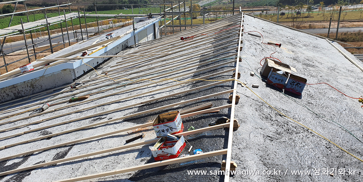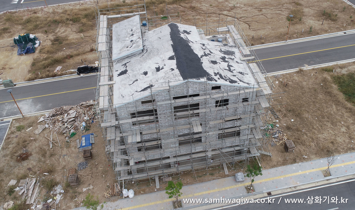 며칠 시간이 흐른 후 벽돌 시공이 모두 마무리되었다는 연락을 받고 다시 현장을 찾았습니다. 벽돌 때문에 비워놓았던 ㄱ자 공간에 후레싱 및 각상을 이어 붙인 후의 모습입니다. 이제 기와를 인양할 준비가 모두 끝났습니다.