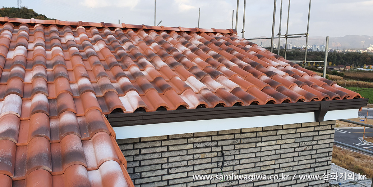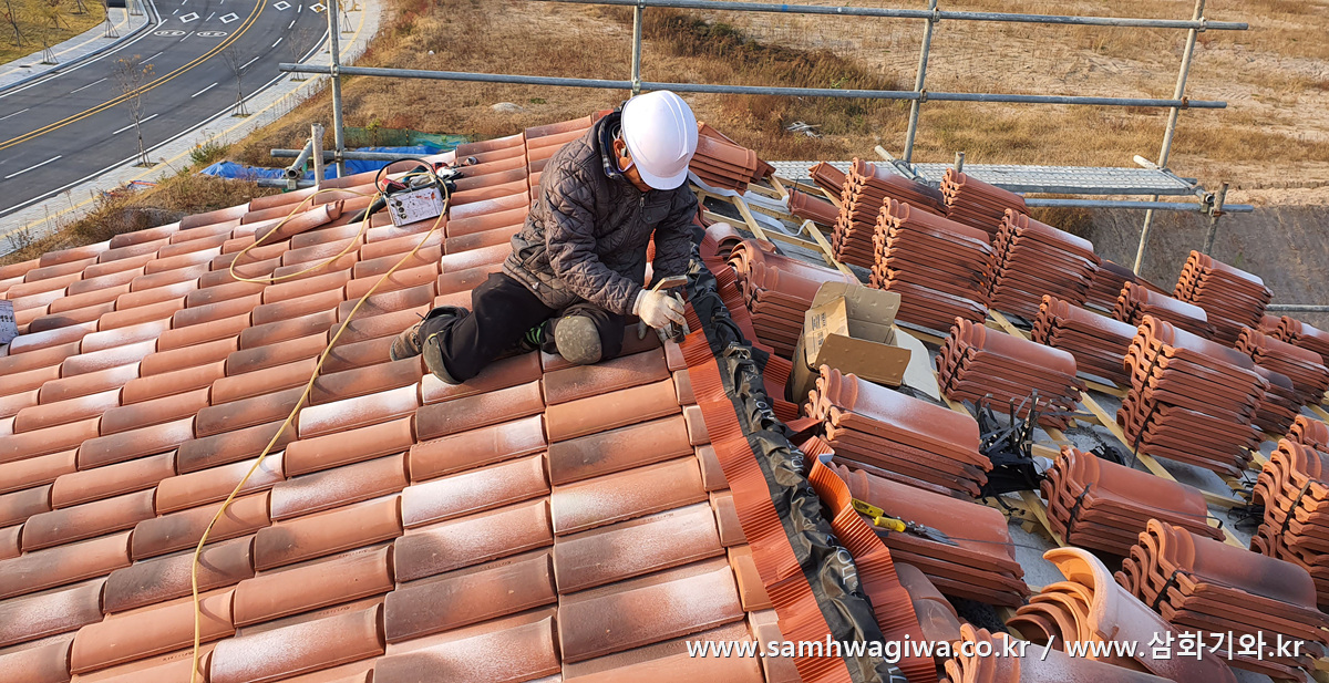 끝기와부터 차근차근 바닥기와를 깔고 있습니다. 기와의 색상이 강렬하면서도 중간중간 흰색 포인트가 섞여 있어 산뜻한 느낌을 주네요.