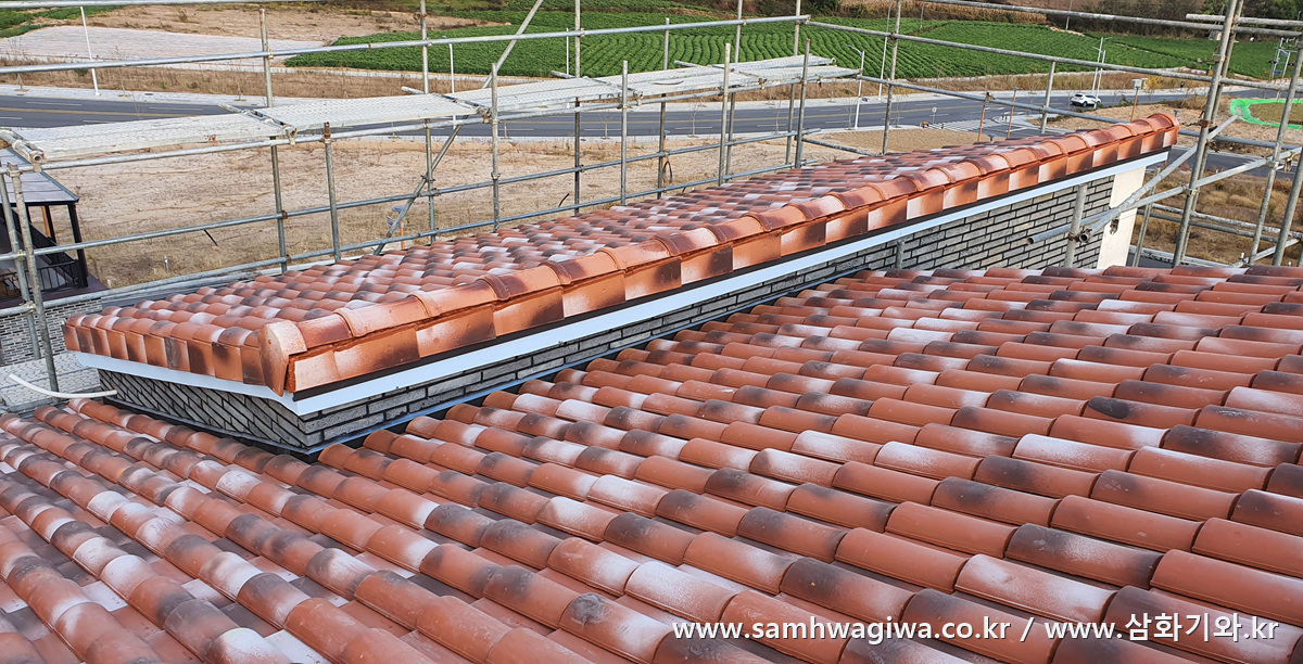 맞배지붕 쪽도 기와 시공이 모두 끝났습니다. 완성된 기와면을 옆에서 바라보니 수평은 물론 기와의 오와 열이 일정하게 잘 맞아 아름다운 패턴을 이루고 있네요.