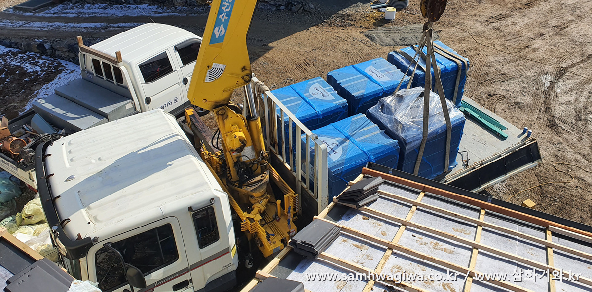 날이 바뀌고 드디어 인양 작업에 들어갑니다. 지붕면에 쌓인 눈을 치우느라 시간이 많이 지체되었습니다. 이번에 사용되는 기와는 프랑스 에디리안(Edilians) 사에서 만든 HP10 평기와로서 현대적인 모던스타일의 디자인과 인터락킹 시스템이 적용된 평기와입니다. 검정색 무광 기와의 모습이 아주 세련되고 멋스럽게 느껴지는 최고급 기와입니다.