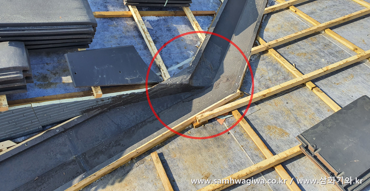 지붕 교차점의 꺾임 부분에는 위 사진과 같이 기와 절단면 위에 방수용 알루미늄 벤트를 한 번 더 붙여줍니다. 이 위에 후레싱으로 다시 한 번 방수 작업을 해야 합니다.