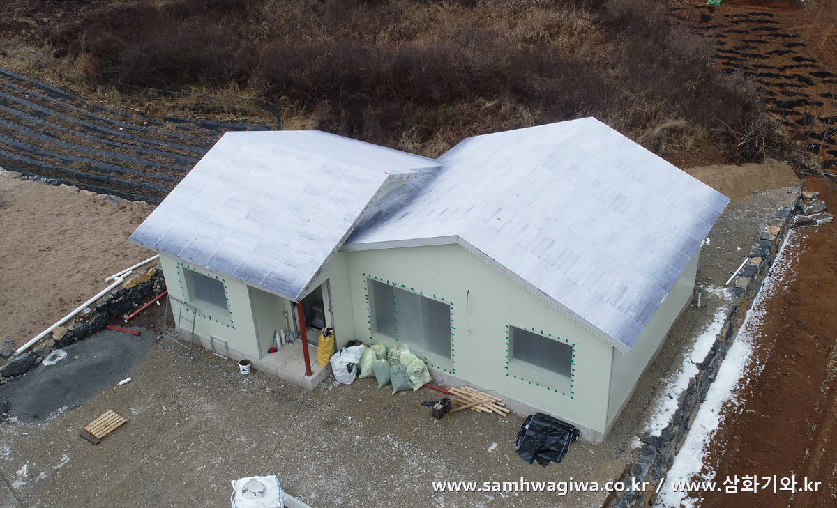 최초 방문시의 모습입니다. 아직 외벽 마감은 이루어지지 않은 모습이며 지붕의 슬라브 옆면 후레싱 역시 마감되기 전이라 샌드위치 패널 옆면의 스티로폼이 그대로 노출되어 있습니다.