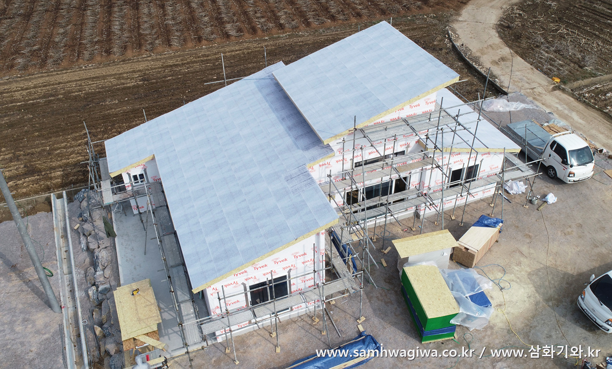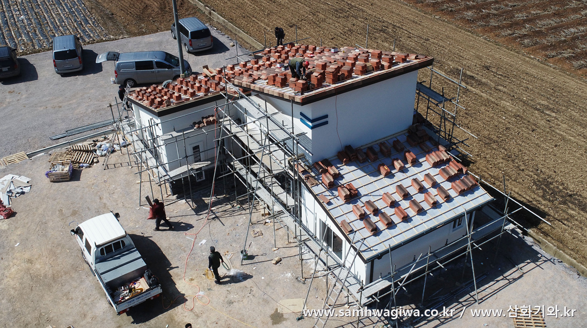 약 2주 정도의 시간이 흐른 뒤 외벽 및 후레싱 마감이 끝난다는 연락을 받고 기와 시공에 들어갑니다. 아직 파벽돌은 붙이기 전이지만 기와 시공에는 문제가 없으므로 바로 각상 작업을 진행합니다.