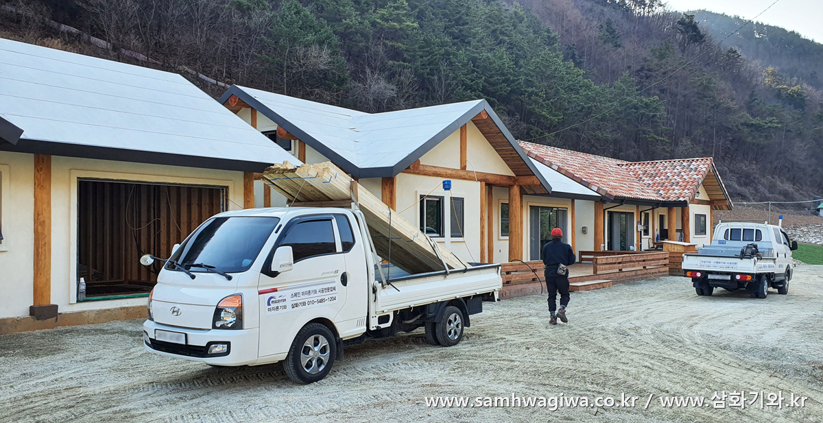 뒷편에 보이는 큰 댓마루는 작업이 끝났고 작은 용마루의 시공이 진행 중이네요. 용마루 기와를 직결 나사와 실리콘으로 단단히 고정하고 있습니다. 마지막까지 꼼꼼하게 마감하고 있는 모습입니다.