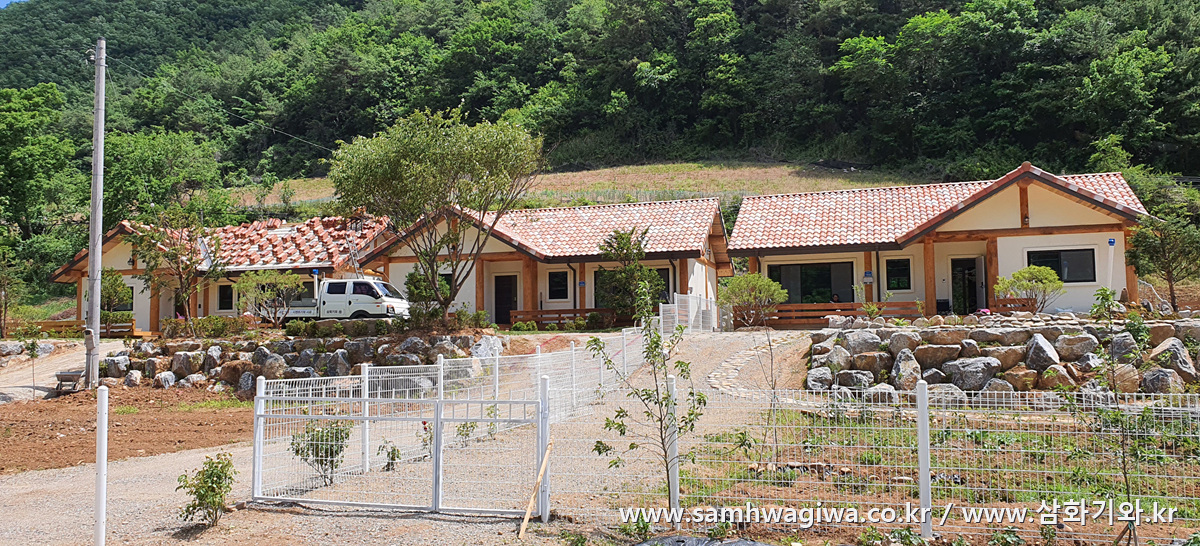 드디어 모든 과정이 마무리되었습니다. 밝은 아이보리 색상의 외벽과 황갈색 통나무 기둥, 그리고 따뜻한 느낌의 기와 색상이 무척이나 조화롭게 잘 어울리는 예쁜 전원주택이 탄생했네요.