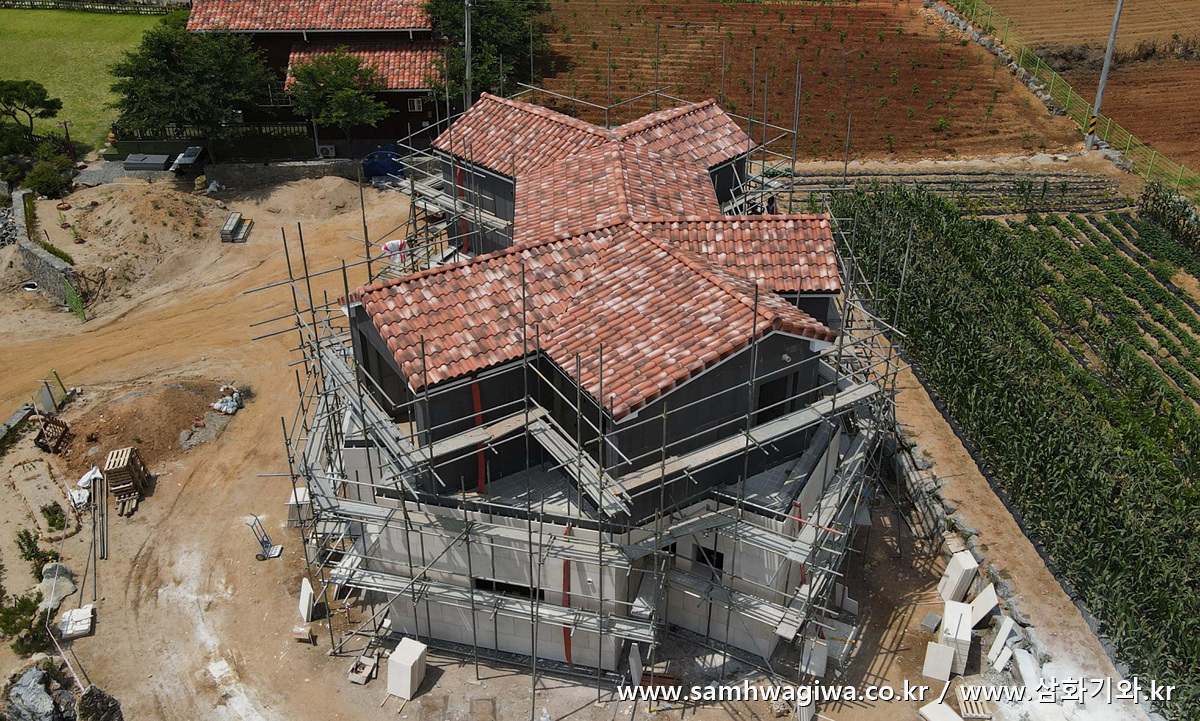 드디어 기와 시공이 모두 마무리되었습니다. 아직 물받이 선홈통 시공이 남았지만 외벽의 석재 작업이 마무리되지 않은 관계로 선홈통 작업은 차후에 시공할 예정입니다.