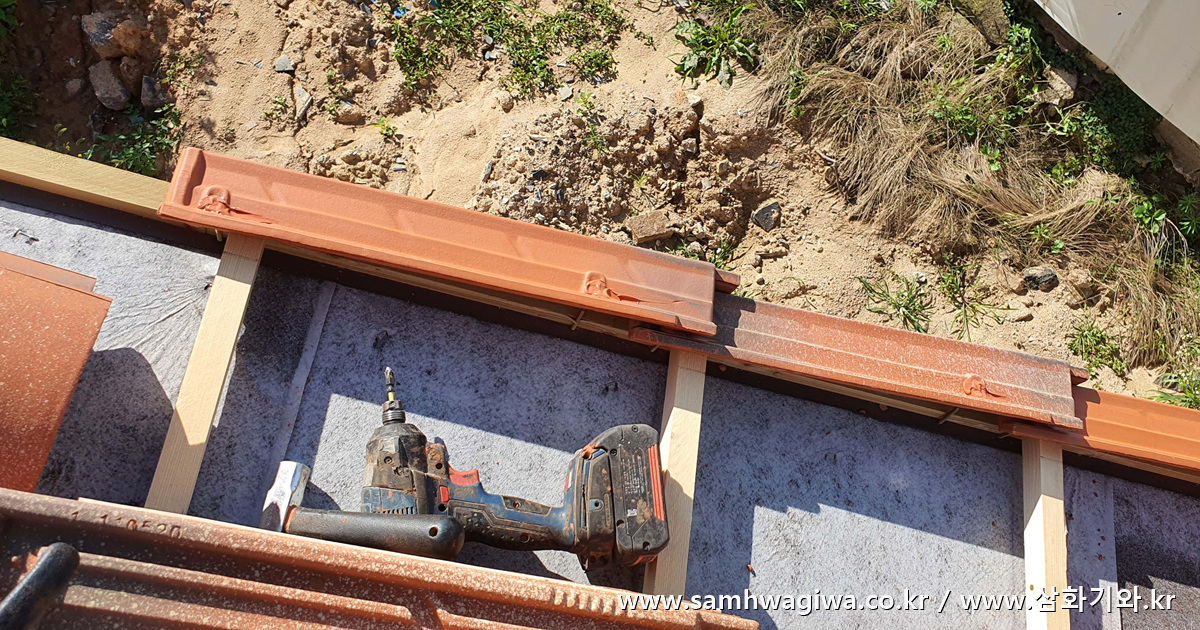 갓기와는 직결 나사로 고정한 후 못구멍을 실리콘으로 마감해야 빗물의 침투를 막을 수 있습니다.