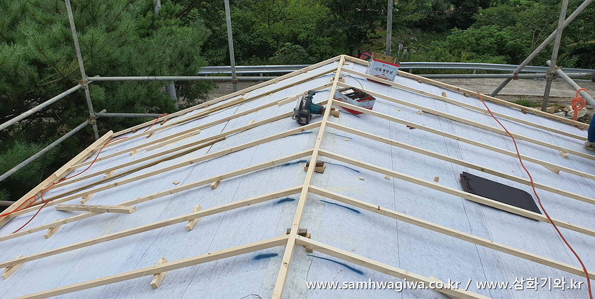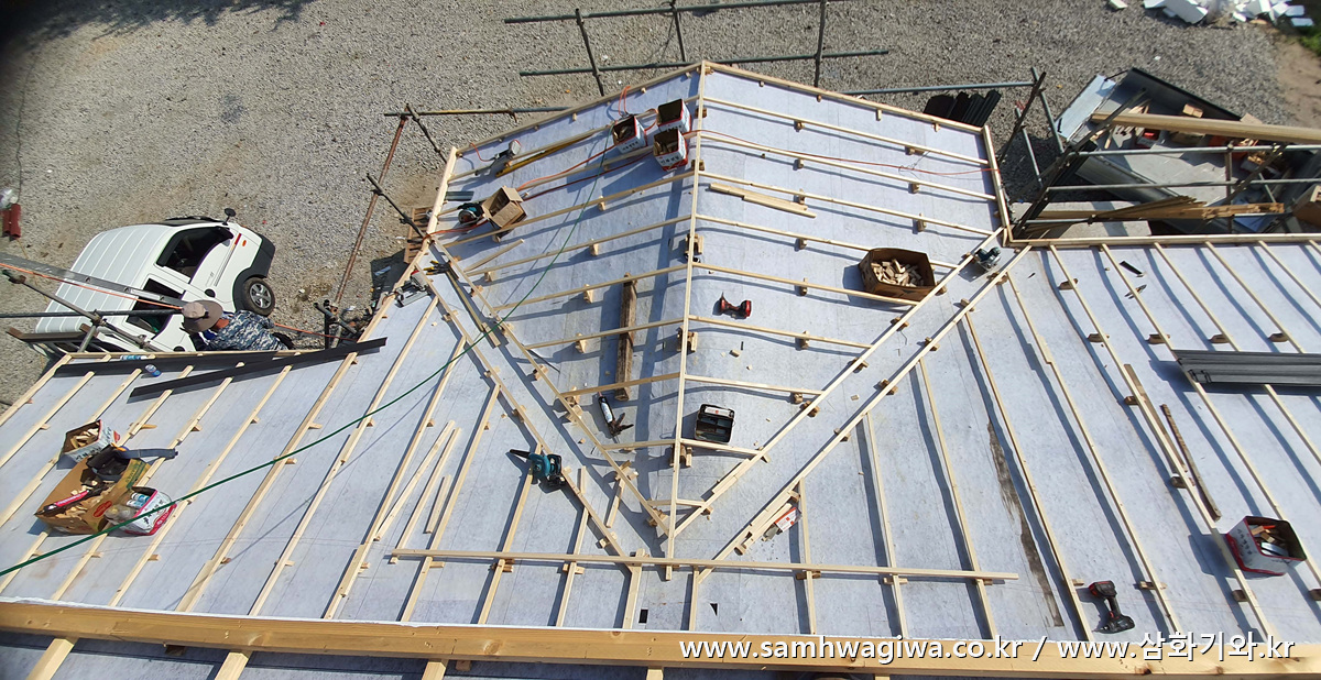 기와 시공이 본격적으로 시작됩니다. 바닥 기와를 반 장씩 교차해서 시공하고 있습니다. 기와골 부분은 틈이 벌어지지 않도록 정확하게 컷팅하여 덮어줍니다.