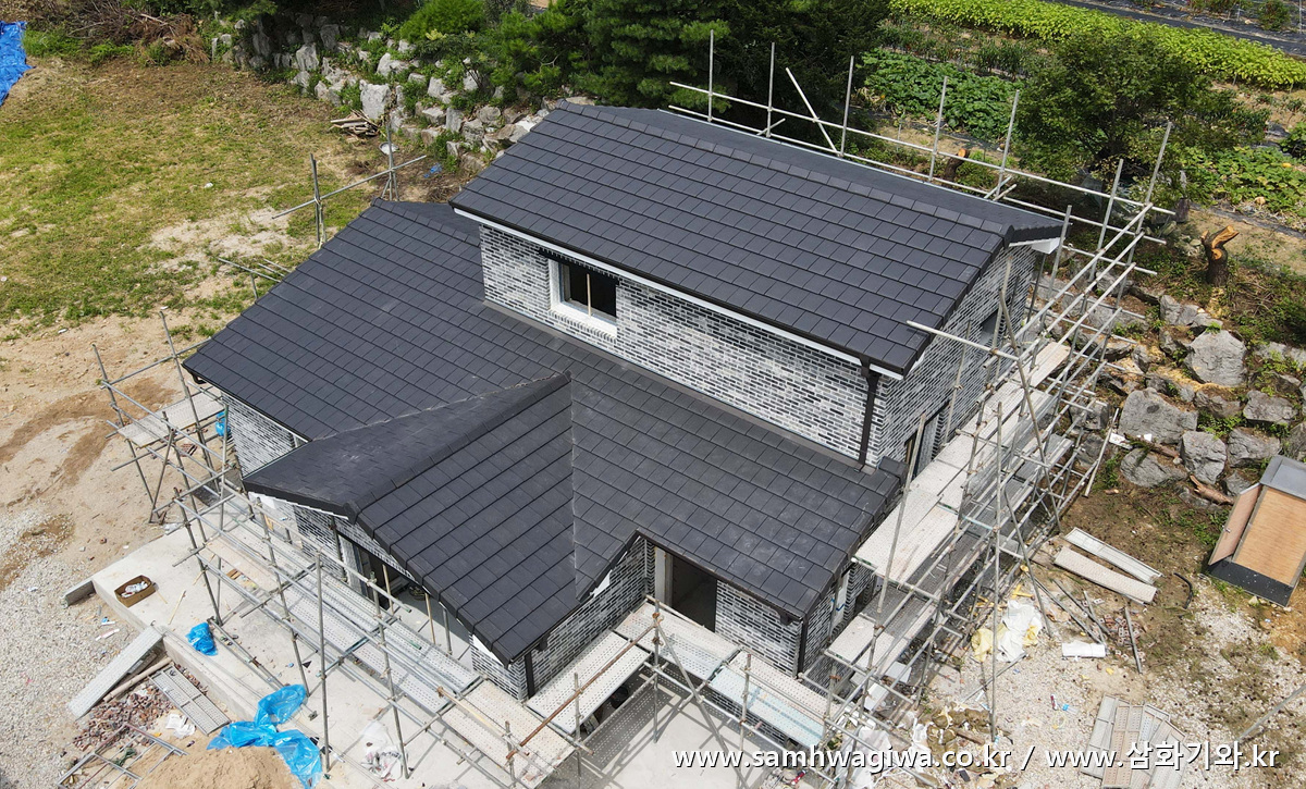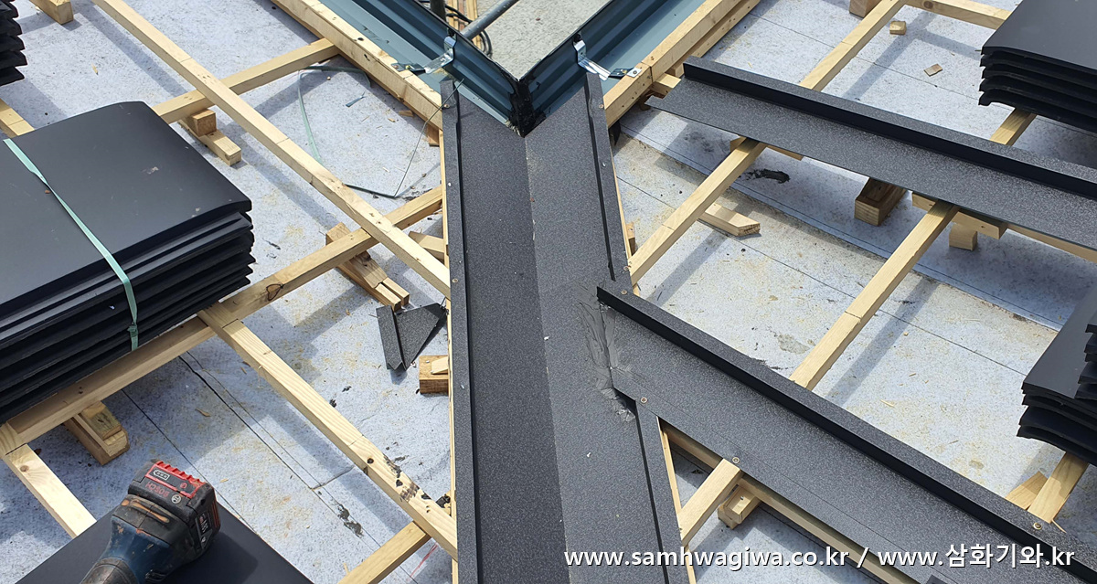 어느덧 기와 시공이 마무리되어 갑니다. 외벽 인접면에는 후레싱을 부착해 방수 마감을 해줍니다.