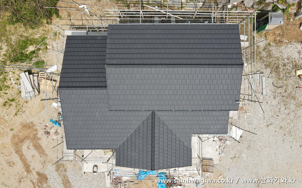 각도에 따라 햇빛에 반사되는 지붕의 모습이 아주 세련되고 멋스럽습니다. 이번 현장에 사용된 기와는 프랑스 에디리안(Edilians) 사에서 만든 HP10 평기와입니다. 현대적인 모던스타일의 디자인과 인터락킹 시스템이 적용된 평기와로서, 진한 무광 블랙의 기와면이 무척 심플하면서도 고급스러운 느낌을 주는 최고급 평기와입니다