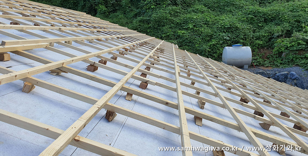 본격적인 지붕 작업에 들어갑니다. 뼈대가 되는 세로상 작업을 하고 있네요. 중간 중간 지붕면이 약간 불룩하게 솟은 곳에는 수평을 잡기 위해 각재보다 얇은 쫄대로 세로상을 놓은 것이 보입니다.