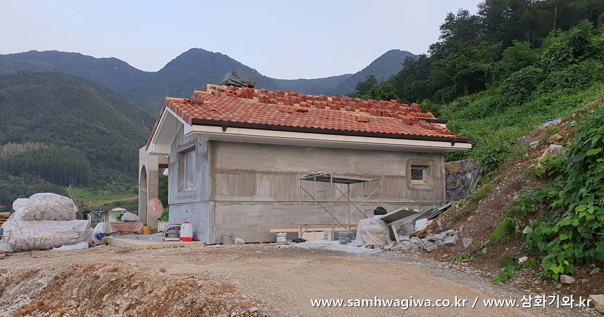 외벽 준비가 되었다는 연락을 받고 기와 시공을 위해 현장을 다시 찾았습니다. 외벽은 스티로폼과 메쉬를 붙인 후 그 위에 시멘트 마무리만 해 놓은 상태이고 아직 스타코 도색은 안 된 상태입니다. 스타코 도색은 나중에 기와 시공이 완성된 후에 한다고 하네요. 지붕면에는 방수 미장을 한 겹 더 해놓은 것을 알 수 있습니다.
