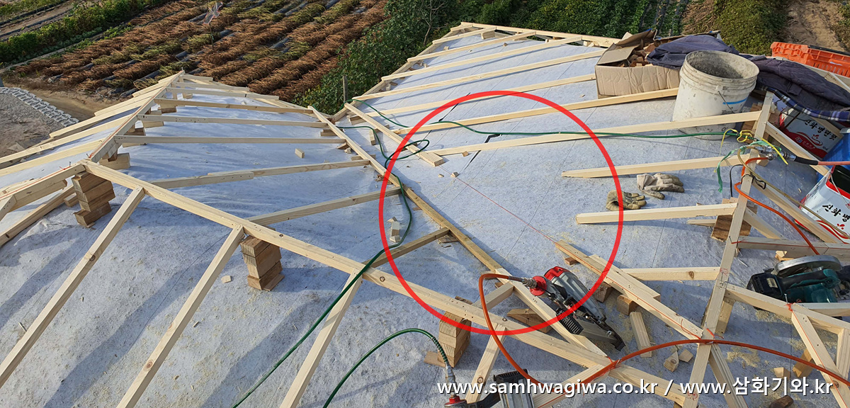 드디어 먹줄 작업 및 물받이 거터도 작업이 끝났습니다. 각상 보강 작업도 진행된 것이 보이네요.