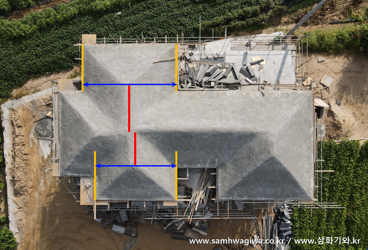 먼저 가로로 긴 용마루를 살펴볼까요. 용마루가 길게 하나로 이어지려면 노란색 실선으로 표시한 좌측 지붕의 너비와 중앙 지붕의 너비가 동일해야 합니다. 그런데 사진에서 볼 수 있듯 두 지붕의 길이가 파란색 화살표 길이만큼 차이가 납니다. 용마루는 당연히 각 너비의 중심, 즉 파란 화살표의 중심에 각각 자리잡아야 하기 때문에 사진의 붉은 실선에서 확인할 수 있듯 교차 부분에서 어긋나게 됩니다.