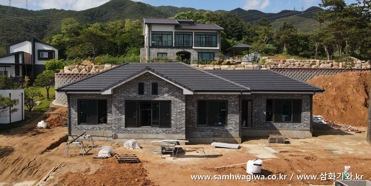 드디어 물받이 선홈통까지 모든 마감이 끝난 후의 모습입니다. 확 달라진 근사한 모습에 감탄사가 절로 나오네요. 차분하고 중후한 느낌의 블랙 무광 지붕이 외벽의 진회색 청고벽돌과 아주 잘 어울려 세련된 모습을 연출하고 있습니다.