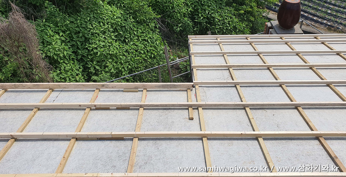 기와가 모두 올라왔습니다. 이번에 사용되는 기와는 마자론 기와의 블랙 색상입니다.