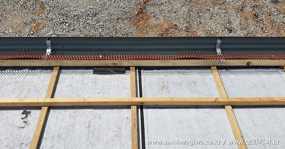 기와를 놓을 자리를 먹선으로 표시하고 물받이 및 새막이까지 부착을 끝냅니다.