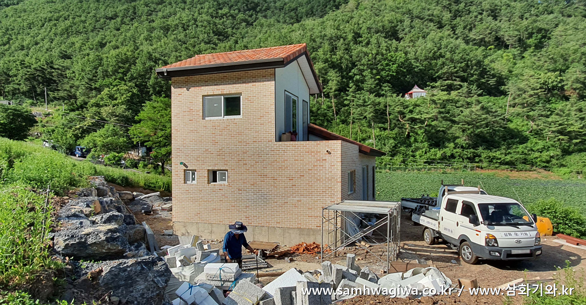 외벽에는 한창 벽돌을 쌓고 있는 모습이 보이네요. 벽돌의 하중 때문에 1층과 인접하는 면은 사이딩으로 마감한다고 합니다. 외벽 및 지붕 마감이 아직 남아 있는 상태이므로 기와 시공은 며칠 더 시간이 흐른 뒤에 시작될 예정입니다.