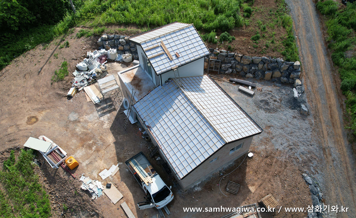 반대편 지붕의 외벽 인접면도 마무리 단계에 접어들었습니다. 기와를 가공하여 실리콘으로 방수하고 있는 모습이네요.