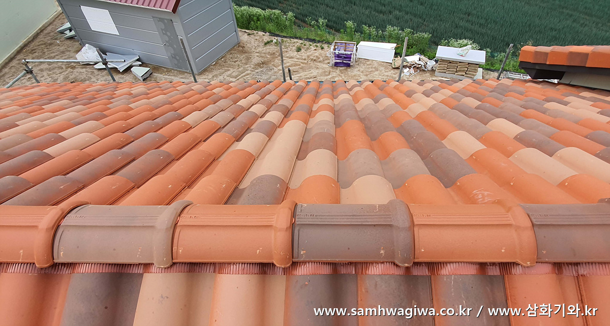 이번에 사용된 기와는 마자론 기와의 새로운 색상인 코르텐(Corten)이라는 모델입니다. 붉은 색과 황토색 위주로 구성한 변색 기와로서 따뜻하면서도 화려한 느낌이 특징인 고급 기와입니다.