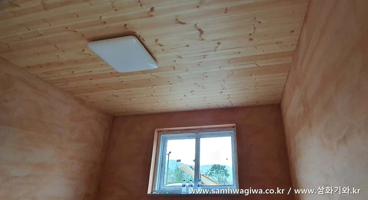 시공 날짜를 잡고 현장을 찾았습니다. 건물 내부도 이미 인테리어가 많이 진행된 모습이네요. 벽체는 별도 도배 작업 없이 황토 미장으로 마감한 상태입니다.