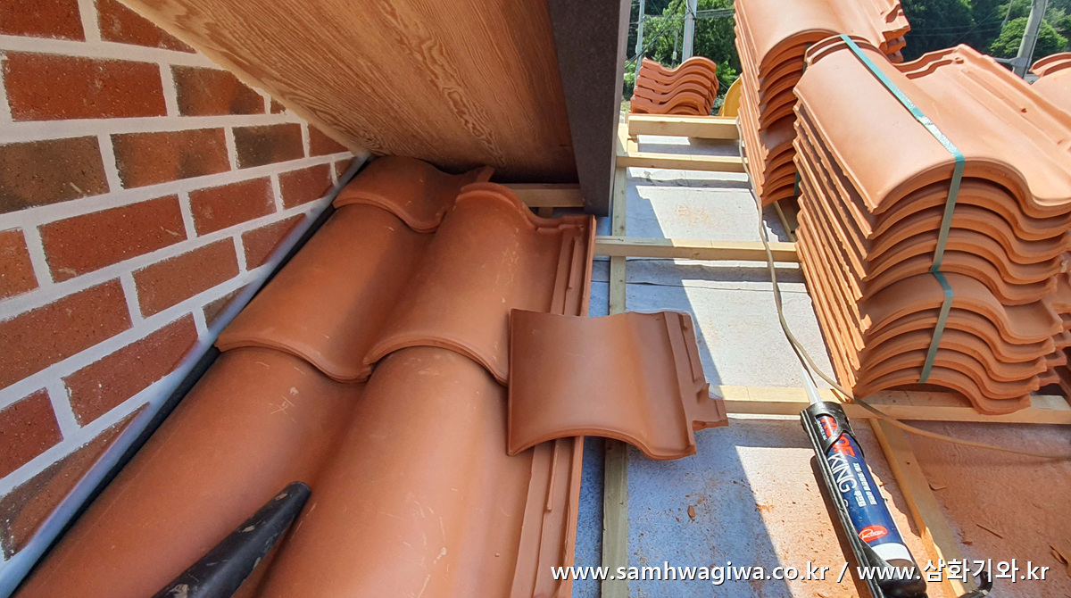지붕 분기 지점에는 바닥 기와를 잘 재단해서 마감해 줍니다.