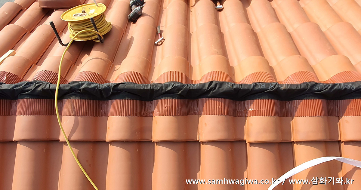 부착이 끝난 벤트 위에 용마루 기와를 한 장씩 씌웁니다. 직결나사와 실리콘으로 단단히 고정하여 바람에 들뜨는 일이 없도록 합니다.