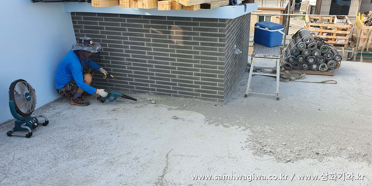 좌측 끝기와부터 시공에 들어갑니다. 시작점 부근에 좌갓이 반 장 정도 들어가네요. 정확하게 절단하여 외장용 실리콘으로 단단히 접착합니다.