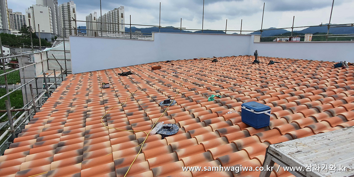 이번 현장은 제천시 장락동에 위치한 주상복합 3층 건물 시공 현장입니다. 지붕의 모양은 외쪽 지붕의 형태인데 물받이 쪽을 제외한 나머지 지붕면이 모두 막혀 있는 폐쇄형 지붕이라 갓기와나 용마루 기와 없이 바닥 기와로만 시공되는 지붕입니다.