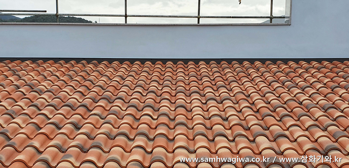 이번에 사용된 기와는 마자론 기와의 새로운 색상인 쏘렌토(Sorrento)라는 모델입니다. 붉은 색과 황토색을 베이스로 하고 중간중간 따뜻한 느낌의 크림색과 회색을 배합해 포인트를 준 변색 기와로서 산뜻하면서도 화려한 느낌이 특징인 고급 기와입니다.