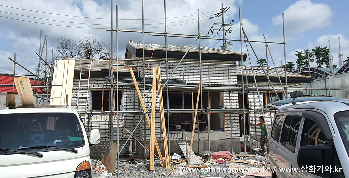 아직 외벽 마감이 시작되기 전이라 외벽 패널부의 철판이 그대로 노출되어 있고 지붕 옆면의 스티로폼도 노출되어 있는 상태입니다. 지붕면과 외벽이 만나는 부분이 많기 때문에 기와 시공은 외벽 벽돌이 마감된 후에 시작할 예정입니다.