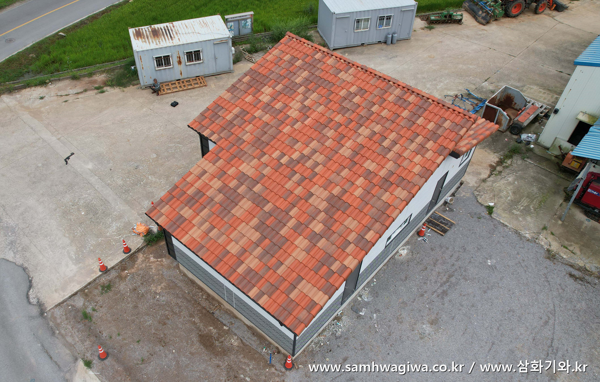 깔끔하고 예쁘게 시공이 잘 마무리되었네요. 이번에 사용된 기와는 마자론 기와의 새로운 색상인 코르텐(Corten)이라는 모델입니다. 붉은 색과 황토색 위주로 구성한 변색 기와로서 따뜻하면서도 화려한 느낌이 특징인 고급 기와입니다.
