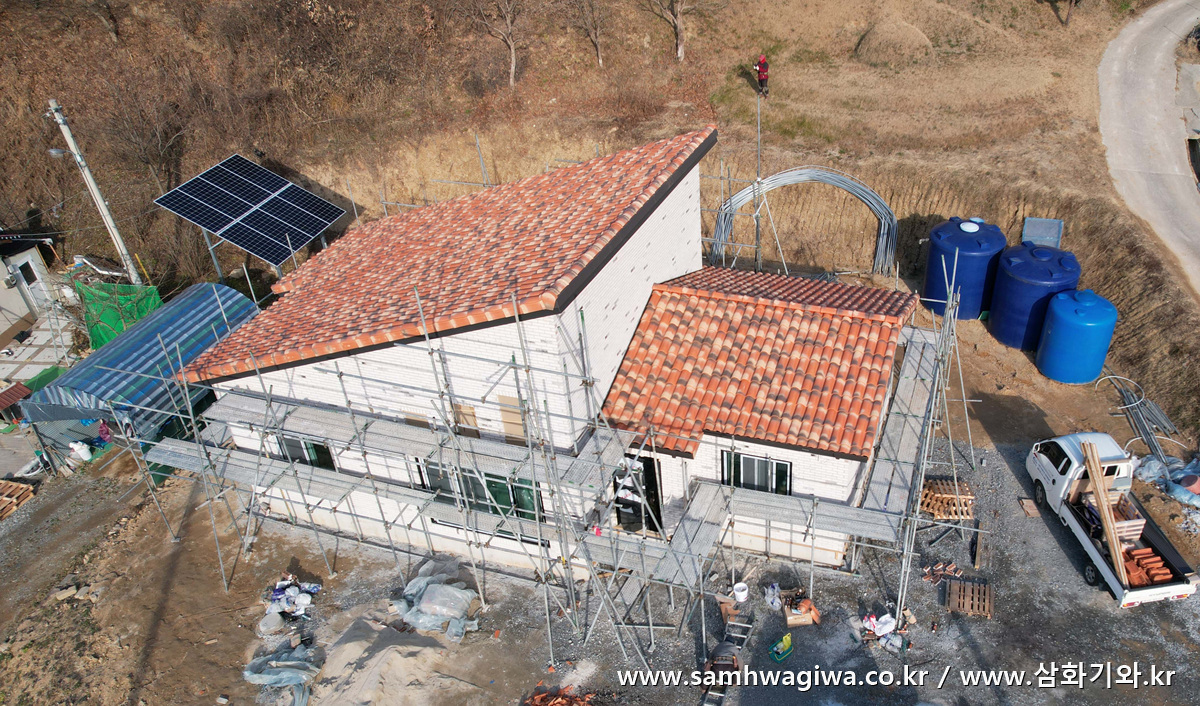 외벽 작업이 모두 끝났다는 연락을 받고 기와 시공을 위해 현장을 다시 찾았습니다. 흰색 바탕에 점점이 포인트를 준 외벽의 색상이 밝고 산뜻한 느낌이 듭니다.