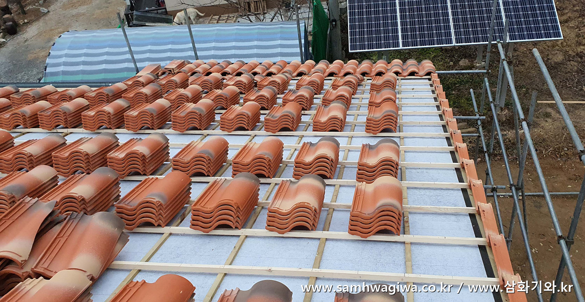 기와를 놓일 자리를 먹선으로 표시하고 물받이 및 새막이까지 모두 부착을 완료합니다.