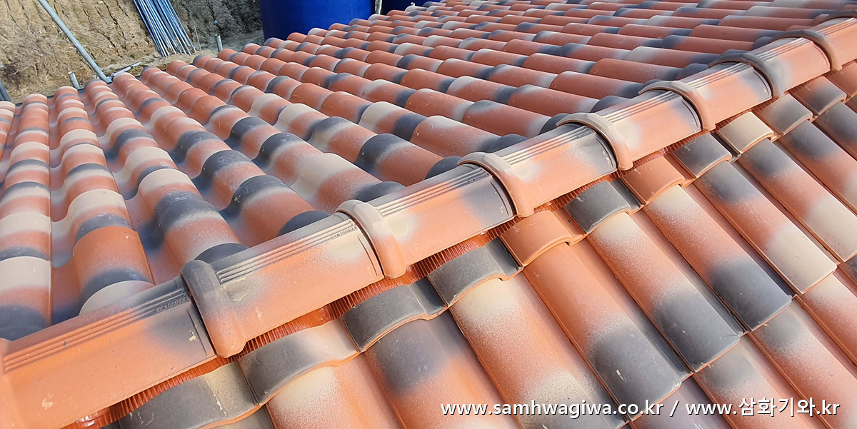 용마루 기와는 직결나사와 실리콘으로 단단히 접착해야 바람에 들뜨거나 날아가지 않습니다.