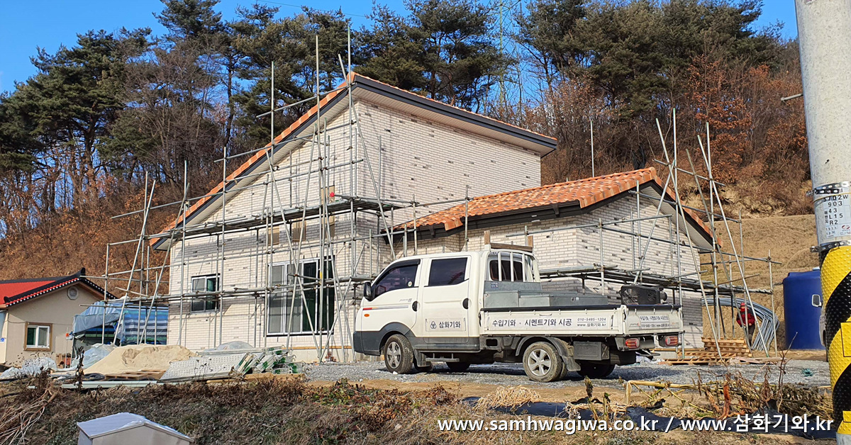 외벽 작업이 모두 끝났다는 연락을 받고 기와 시공을 위해 현장을 다시 찾았습니다. 흰색 바탕에 점점이 포인트를 준 외벽의 색상이 밝고 산뜻한 느낌이 듭니다.